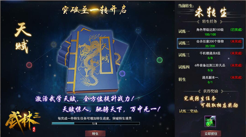 初入江湖的凡夫俗子,仰望着大神们登萍渡水、踏雪无痕的身姿,还有那快如闪电的刀剑在风中尽情挥舞,不时就会流露出一丝羡慕的神情,毕竟百级之后便不再是平凡的自己。在《武林三》里,当玩家角色等级角色达到100级且完成主线任务后就会经历一次全新的洗礼——转生系统开启。转生系统可以帮助角色再一次进化,进入转生面板后可以看到几项信息,首先是转生任务,需要完成四重试炼以及转生副本才可达成一转。完成突破后,还可获得该阶段的转生奖励哦!