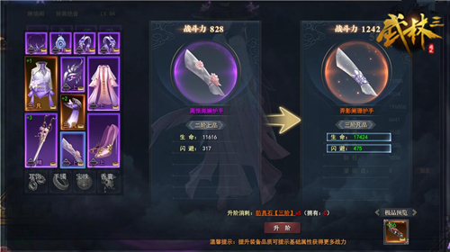 试炼一、二、三在前100级时很多高手们就已陆陆续续地完成,但就试炼四的“6件装备达到三阶凡品”而言会让不少人为之头痛,介于早前对装备的疏忽,很多人到了百级却并没有配备多件高阶装备,因此需要在后期补足。进入角色面板,消耗装备材料为装备升阶,升阶成功后装备品质得到提升,对应的基础属性也会获得大幅提升!